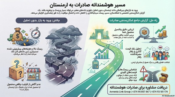 در Armenia Link Group، ما با تکیه بر تجربه عملی، دانش تخصصی مارکتینگ بینالملل و شناخت عمیق از بازار ارمنستان، خدمات جامع مطالعه و تدوین گزارش امکانسنجی صادرات را بهصورت کاملاً حرفهای و مبتنی بر دادههای واقعی بازار ارائه میدهیم. این گزارشها صرفاً مجموعهای از اطلاعات تئوریک نیستند، بلکه ابزار تصمیمسازی مدیریتی محسوب میشوند که به صاحبان کسبوکار کمک میکنند با اطمینان بیشتر وارد بازار ارمنستان شوند. در فرآیند ارائه این خدمت، ابتدا محصول یا خدمت شما بهطور دقیق مورد ارزیابی قرار میگیرد تا میزان تطابق آن با نیازها، ترجیحات و قدرت خرید بازار هدف مشخص شود. سپس تحلیل جامعی از رقبا، ساختار قیمتگذاری، کانالهای توزیع و الگوهای رفتاری مصرفکننده انجام میشود تا جایگاه واقعی شما در بازار قابل پیشبینی باشد. یکی از بخشهای کلیدی این گزارش، شناسایی ریسکها و چالشهای احتمالی ورود به بازار است؛ از ریسکهای حقوقی و مقرراتی گرفته تا موانع فرهنگی، لجستیکی و رقابتی. در کنار این موارد، فرصتهای پنهان بازار نیز شناسایی شده و سناریوهای مختلف ورود به بازار مورد بررسی قرار میگیرند. نقطه تمایز خدمات Armenia Link Group، ارائه توصیههای کاملاً کاربردی با رویکرد تخصصی مارکتینگ است؛ توصیههایی که قابل اجرا بوده و بهصورت مستقیم بر افزایش شانس موفقیت صادراتی شما اثر میگذارند. این توصیهها میتوانند شامل پیشنهادات مرتبط با استراتژی ورود به بازار، مدل قیمتگذاری مناسب، شیوههای بازاریابی و فروش، انتخاب شرکای تجاری و حتی زمانبندی بهینه ورود به بازار باشند. هدف نهایی ما این است که با کاهش عدم قطعیتها، ریسک سرمایهگذاری شما را به حداقل رسانده و احتمال موفقیت شما در بازار ارمنستان را بهطور معناداری افزایش دهیم. با استفاده از این خدمات، تصمیمگیری شما از یک انتخاب حدسی به یک تصمیم استراتژیک و مبتنی بر تحلیل حرفهای تبدیل خواهد شد.
